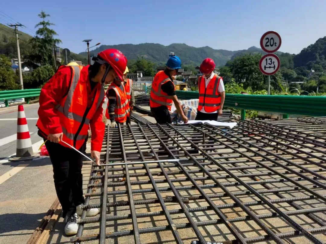 吴敬媛(左一)在省道206线古勇桥普通省道危旧桥梁改造工程检查施工质量。
