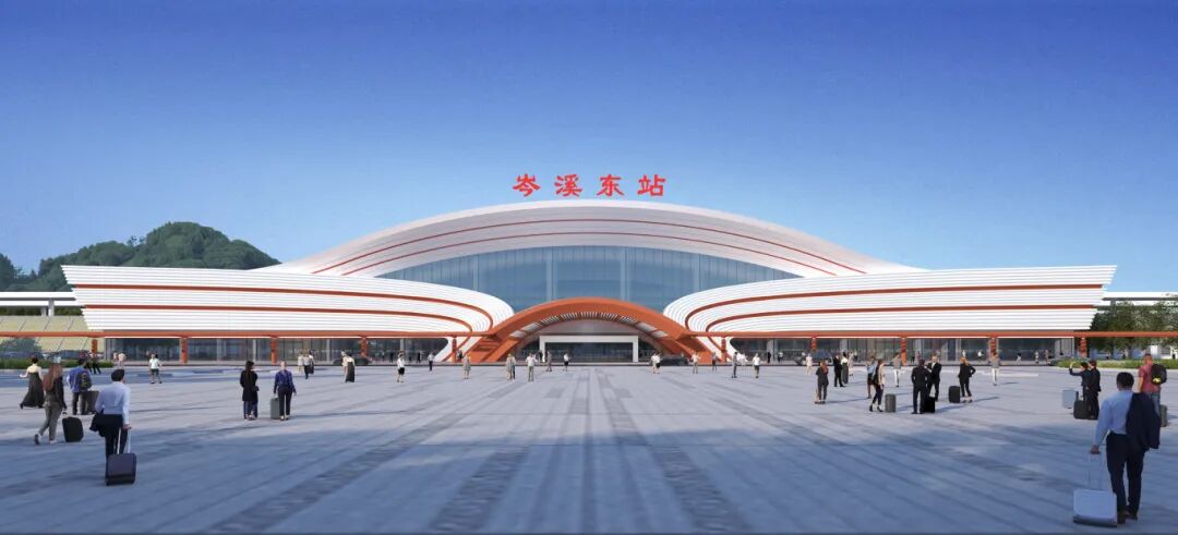南珠高铁玉岑段全线共新建容县南、岑溪东两座车站,其中,岑溪东站站房建筑面积11929.60平方米,站场规模为2台6线,最高可容纳800人同时候车。站房以 “岭南岩都,牛戏之乡” 为设计主题,萃取岑溪两大文化符号 ——“花岗岩之都” 的厚重底蕴与 “牛娘戏” 的灵动韵味,从立面造型到细部设计,全方位打造出一座烙印着鲜明地域特色的现代化公共交通枢纽。