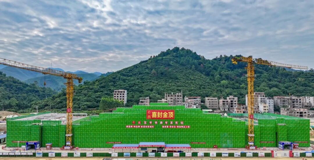南珠高铁玉岑段最大新建站房主体结构顺利封顶。(封荣权 摄)