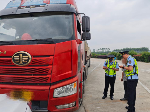 接报后,该支队立即启动应急处置机制,迅速联合公安交警部门进行处置。该支队执法人员立即通过技术查询平台定位冲卡车辆的实时位置信息,并和沿线ETC门架信息进行比对,逐一排查车头及货物外观特点后,锁定车辆行驶轨迹。在了解涉案车辆信息、冲卡时间点、行驶轨迹、实时位置等相关情况后,该支队执法人员迅速部署,和辖区各大队密切配合,根据充卡车辆的行驶轨迹进行拦截。拦截过程中联合公安交警部门对该车辆开展追缉,同时通知辖区各个治超检测点做好各项应急准备工作,确保后续处理工作有序进行。经过3个多小时的追查,涉事车辆于当日下午4时在S13富钟高速钟山服务区被成功拦截,该支队执法人员立即引导涉事车辆至贺州市富川瑶族自治县进行称重勘验。经核实,该车辆为超限运输车辆。